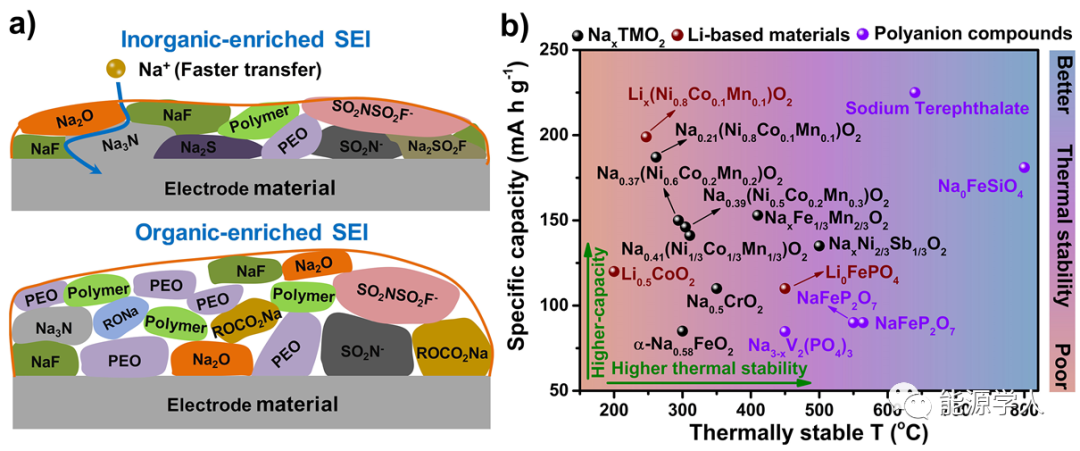 图4 a)阳极表面无机物种富集SEI(顶部)和有机物种富集SEI的示意图。b)各种SIBs正极材料的比容量和热稳定性的比较(热稳定性数据通过DSC测定脱钠态材料获得)。