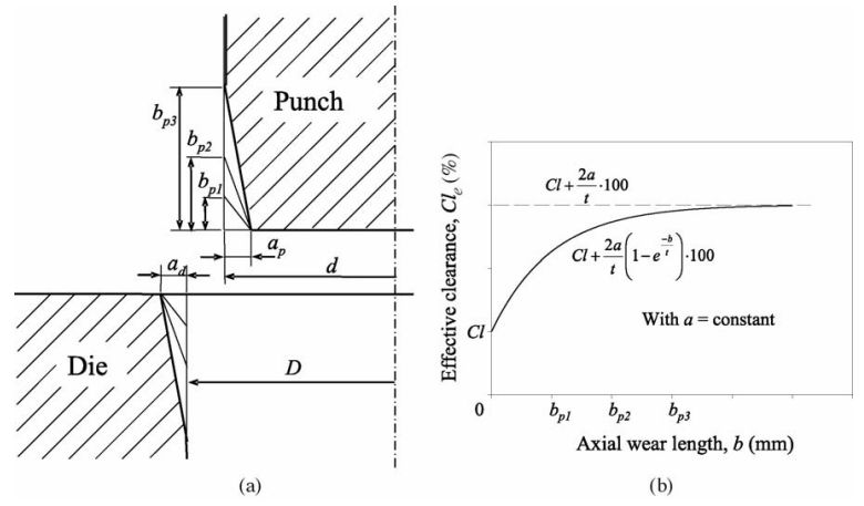 (a)模具磨损示意图,(b)有限冲切间隙随着磨损量增加曲线关系