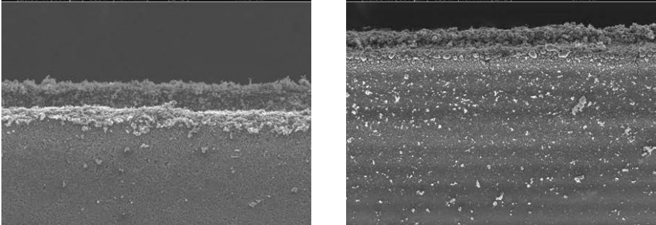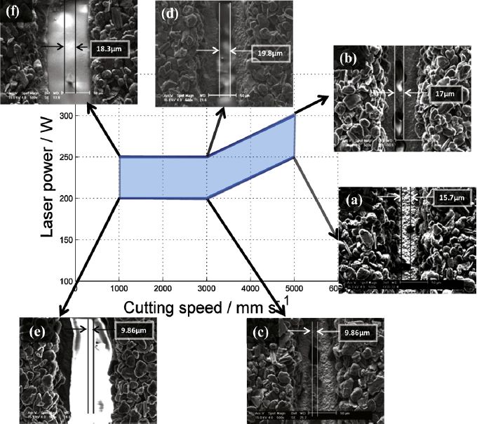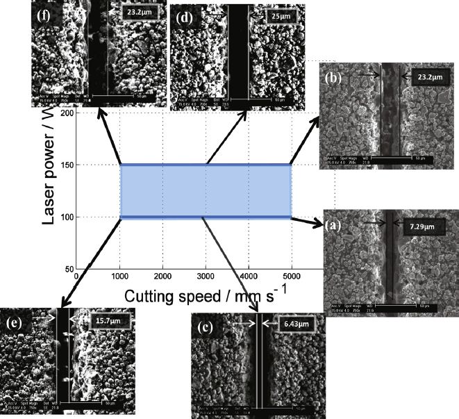 其中,激光能量和切割移动速度是两个主要的工艺参数,对切割质量影响巨大。图5是不同的激光切割工艺条件下单面涂层负极极片的切边形貌,图6是不同的激光切割工艺条件下单面涂层正极极片的切边形貌。当激光功率太低或者移动速度太快时,极片不能完全切开,而当功率太高或移动速度太低时,激光对材料作用区域变大,切缝尺寸更大。