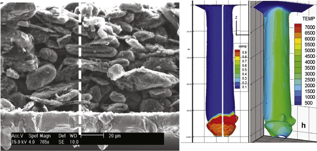 由于锂离子电池极片是双面涂层+中间集流体金属层的结构,而且涂层与金属箔材之间性质差异大,对激光作用的响应也不相同。激光作用在负极石墨层或正极活物质层时,由于它们具有很高的激光吸收率,导热系数也很低,因此,涂层需要相对较低的熔化和汽化激光能量,而金属集流体对激光具有反射作用,并且热传导快,因此金属层的熔化和汽化激光能量升高。图7是单面涂层的负极在激光作用下极片厚度方向的铜成分和温度分布,当激光作用在石墨层时,由于材料的特性,石墨主要发生汽化,当激光侵入到金属铜箔时,铜箔开始发生熔化,形成熔池。工艺参数不合适时,可能出现问题:(1)切边涂层脱落,露出金属箔材,如图8左图所示;(2)切边周围出现大量切屑异物。这些都会导致电池出现性能下降、安全性品质问题,如图8右图所示。因此,当采用激光切割时,需要根据活物质材料和金属箔材的特性,优化合适的工艺参数,才能既完全切割极片,又形成良好的切边质量,不产生金属切屑杂质残留。
