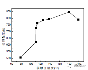 焊接工艺参数不同,导致焊机供给被焊工件的焊接总能量变化,必然引起焊接过程中的摩擦作用不同,致使焊接过程中产生的热量变化,那么焊接过程中工件的温度也将随之变化,焊头-工件接触区温度可以有效反映接头强度,可以通过测量焊接过程中工件的温度预测接头质量。但接触区温度并不是越高越好,对于每种被焊材料匹配,都有一个临界温度值,工件温度小于临界温度时,温度越高则接头强度越高;工件温度大于临界温度时,接头强度则会减弱。