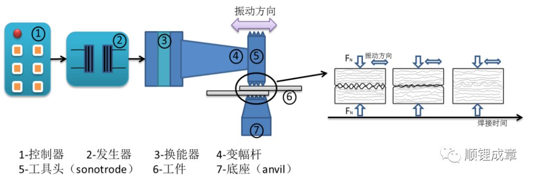 在超声焊接过程中,换能器把高频电信号转化为超声振动信号,高频振动通过焊接工具头传递到待焊金属表面,界面金属氧化膜在一定的压力和超声振动的剧烈摩擦作用下破碎,界面洁净金属接触并在摩擦和超声软化的共同作用下,进一步产生塑性流动和扩散使连接面积逐渐增大最终形成可靠的连接。