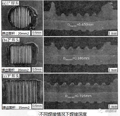 焊头是超声波金属焊接的关键组成部分,焊接过程中,焊头在压力作用下要抓紧被焊工件,这样,超声波焊机产生的机械振动才能传递给被焊工件界面以形成固相连接。焊头面积不同,会导致焊接过程中焊接压力的分布不同,即连接界面的具有不同的应力,使焊接过程中摩擦力不同,从而使焊接过程中摩擦产热量不同,导致焊接过程中工件温度不同,最终影响接头质量。而焊头花纹齿深则决定焊头花纹嵌入工件表面的难易程度,也直接影响工件表面压痕深度,间接影响焊接过程中工件温度,对接头质量造成影响。因此,焊头形貌及尺寸对接头质量有非常关键的作用。