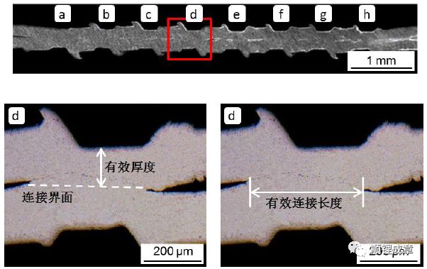 工件与工件连接界面仅在压痕槽下方存在连接,接头连接界面的所有槽下方的连接长度求和得到接头连接长度的总和,称之为有效连接长度,也是塑性变形量的一个衡量指标。